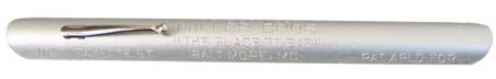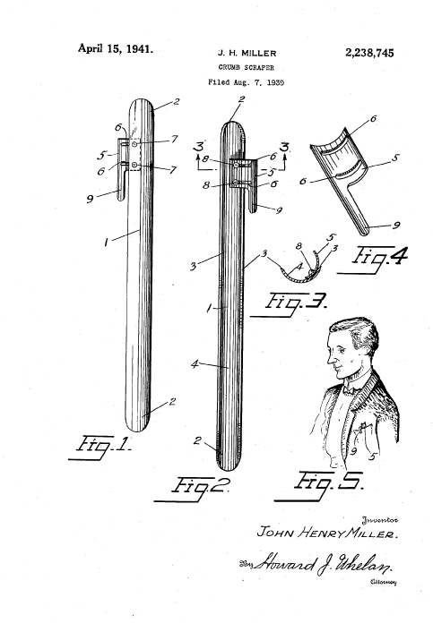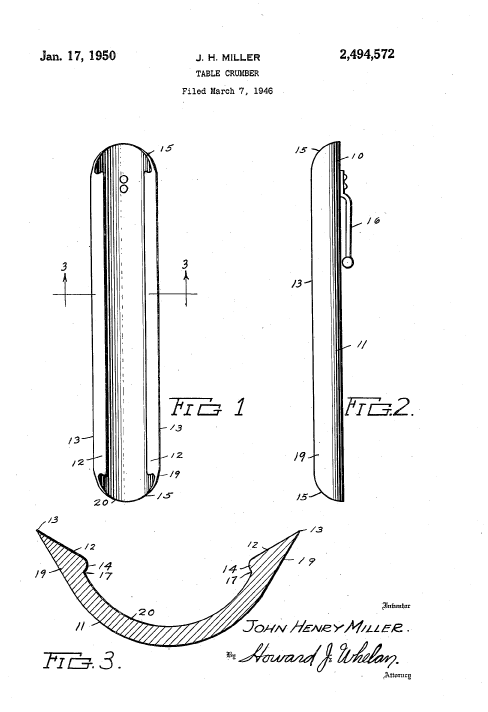 In 1946 Miller applied for a patent on his improvements to the crumb scraper. Miller points out that the existing finger operated crumb scraper" ... has the disadvantage of being able to retain the crumbs gathered up if it is held on its scooping edge against the surface, but tilted backwardly to do so." Miller solved the problem by forming ridges on the inner surface of the scraper to retain the crumbs. His dissertation on the manufacture and usage closes with "The scoop is neat and being pocket size avoids the objection which the more cumbersome dust pan offers for the same type of duty."