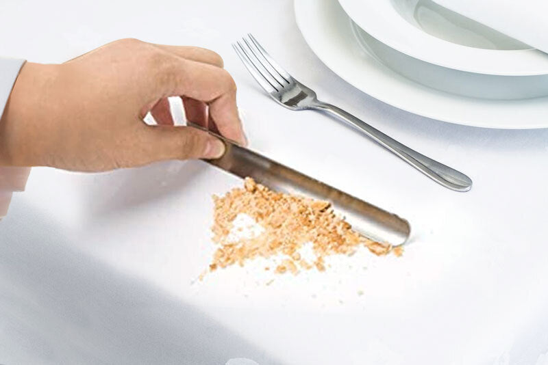 After the customer has finished the main course of the meal, the server will again clean the tablecloth and use the dishes being removed to dispose of the crumbs. This leaves the cloth clean for the serving of desert or after-dinner drinks.